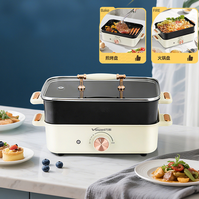 一锅两盘深火锅盘+浅煎烤盘双盘设计,4L大容量,一机料理多重美味全家欢享。分体设计锅体与底座分体设计,端桌分享热闹畅涮,清洗从容更到位。加热均匀1200W大功率,360度发热圈加热均匀不久等。旋钮控温旋钮控温操作,灵活掌握精准火候。玻璃锅盖耐高温玻璃锅盖,烹饪过程可视化。