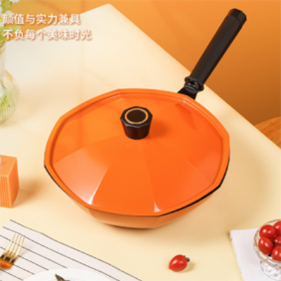 1.产品八角形微拱设计,45°旋转魔法锅盖,八面八角透气设计八大出气孔,高水位烹饪不益锅,八角倒流口倒汤不挂壁。